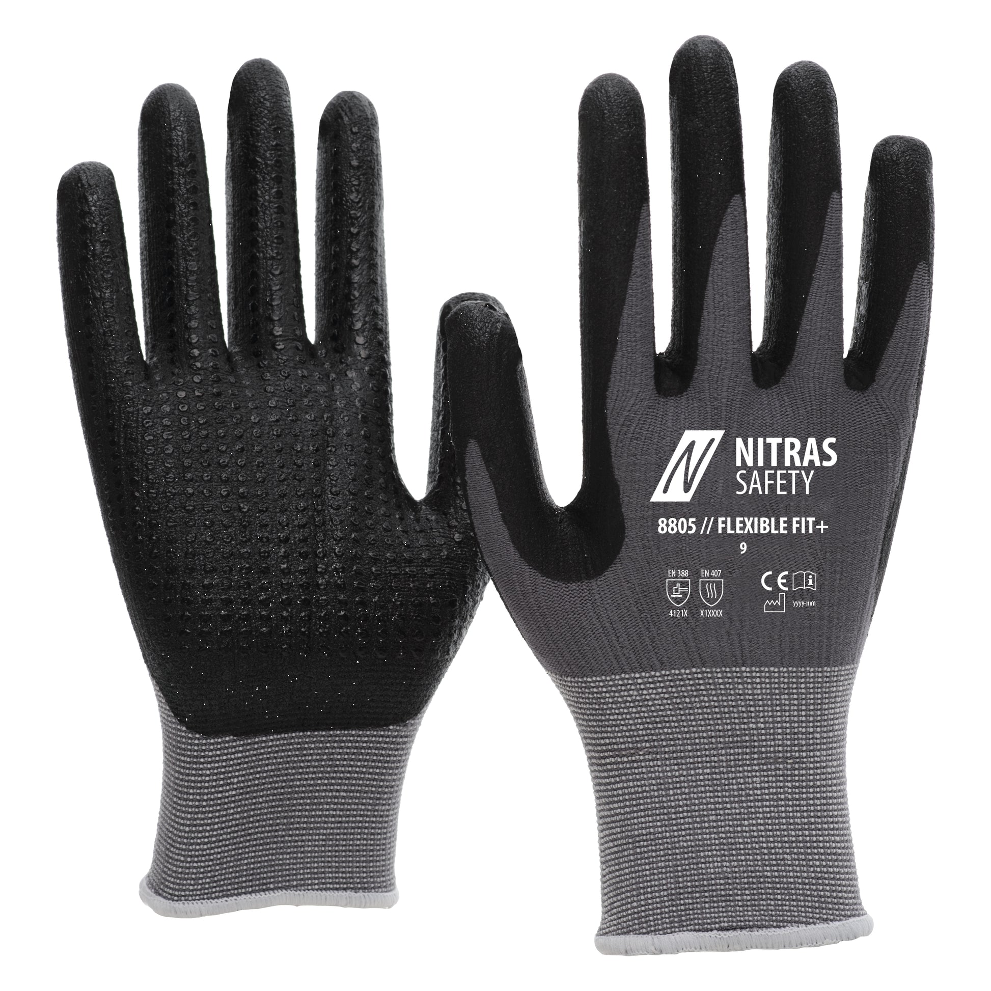 The NITRAS FLEXIBLE FIT+ assembly gloves in gray with black nitrile coating and nitrile knobs set new standards in terms of comfort, protection and precision. Thanks to the partially coated palm and fingertips, they offer an excellent grip and are particularly abrasion-resistant and water-repellent. Thanks to the high-quality workmanship according to OEKO-TEX STANDARD 100®, they are skin-friendly and ideal for longer use. The assembly gloves provide reliable protection against contact heat up to 100° C (for 15 seconds) and belong to PPE risk category II - ideal for demanding work environments.
